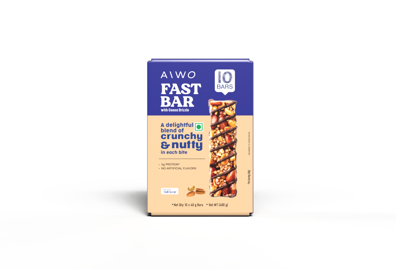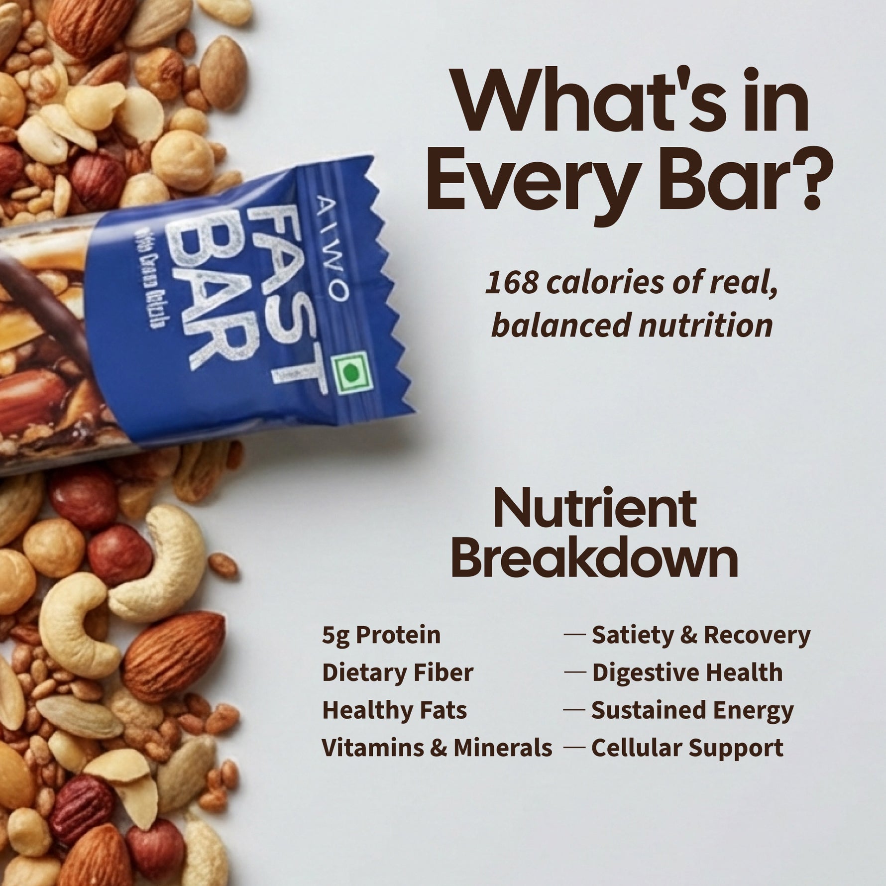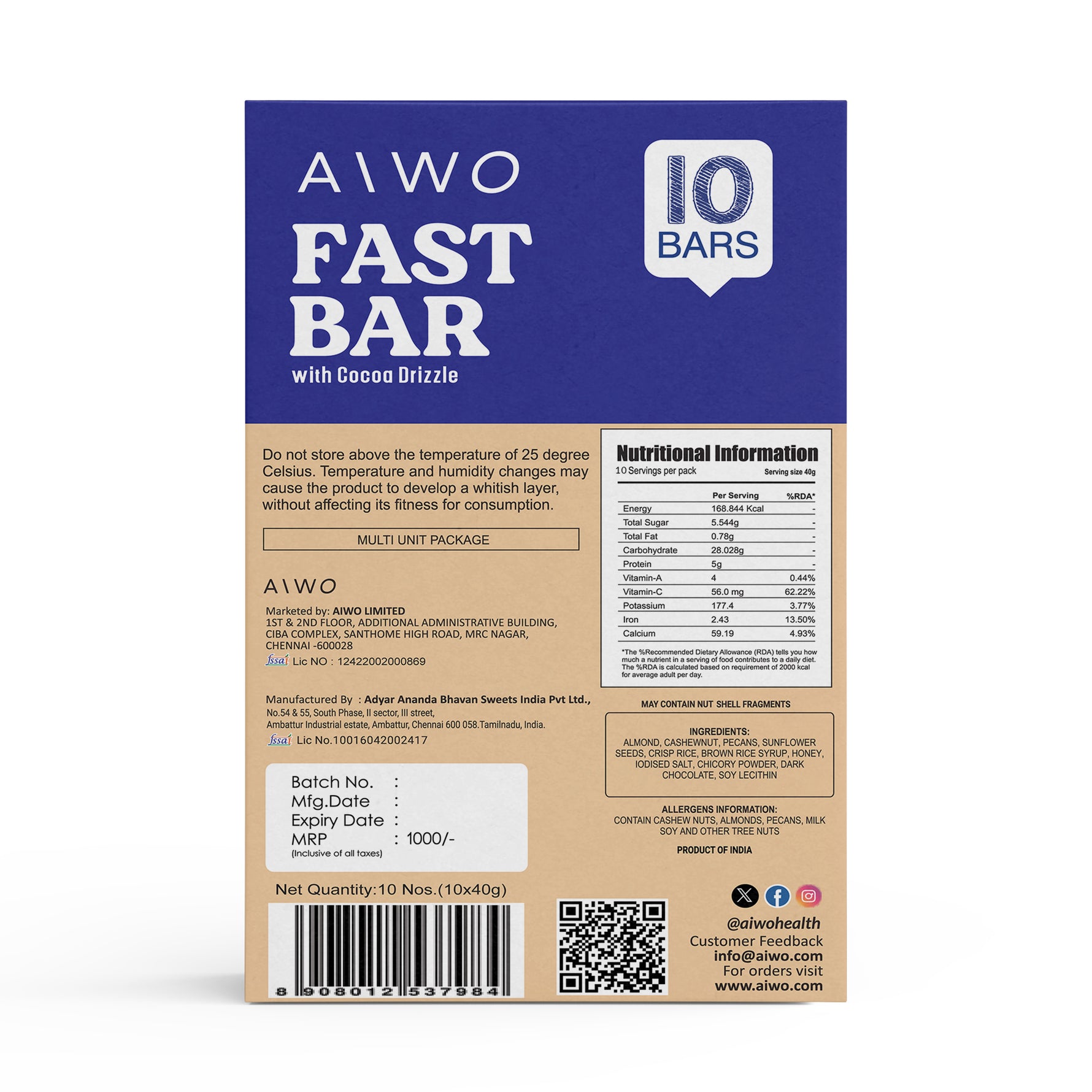 Unit price perAIWO Fast Bars are 40 grams of nut bars with 5 grams of protein, free from artificial flavors and gluten. It is gluten-free, rich in unsaturated fats, phytonutrients, fibers, and enriched with a cocoa drizzle and himalayan salt.