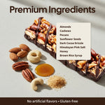 Almond, cashewnut, pecans, sunflower seeds, crisp rice, brown rice syrup, honey, iodised salt, chicory powder, dark chocolate, soy lecithin
